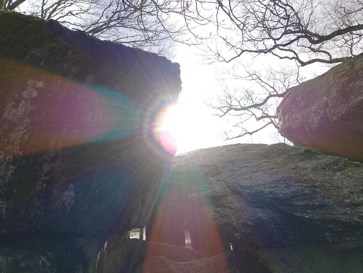 A certaines dates clés de notre calendrier, comme les équinoxes et les solstices, on observe un rayonnement particulier du Soleil à La Roche aux Fées à travers les pierres…